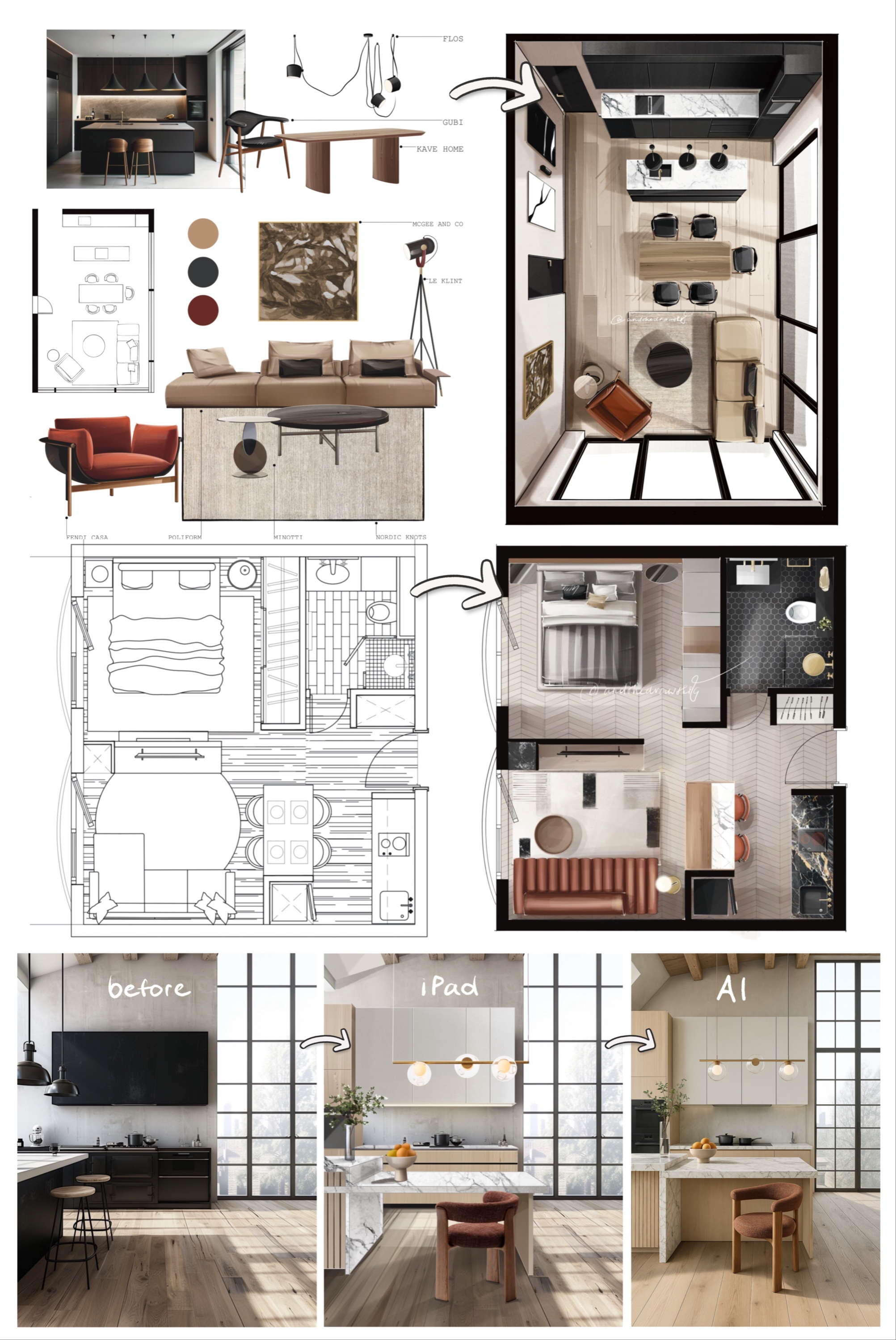 Floor plans, bird’s-eye views, design development sketches, moodboards and integrated workflows.