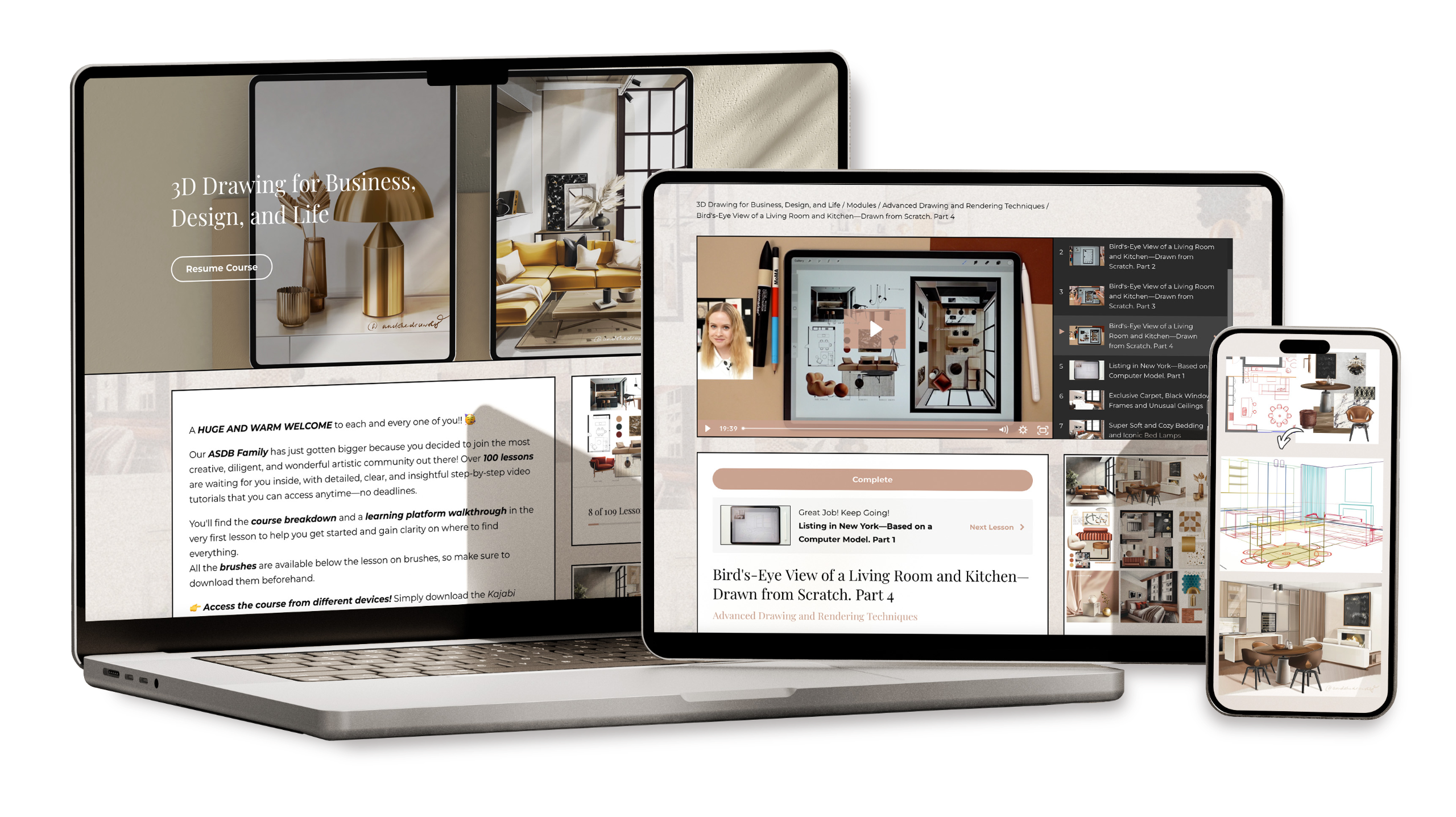 Industries like interior design, real estate, and hospitality will ALWAYS be building, modernizing, and evolving meaning your skills stay relevant no matter where you live or work. You’re not just learning to draw a chair—you’re learning how to visualize and communicate entire spaces: mastering 3D perspective, proportions, aesthetics, and detail.