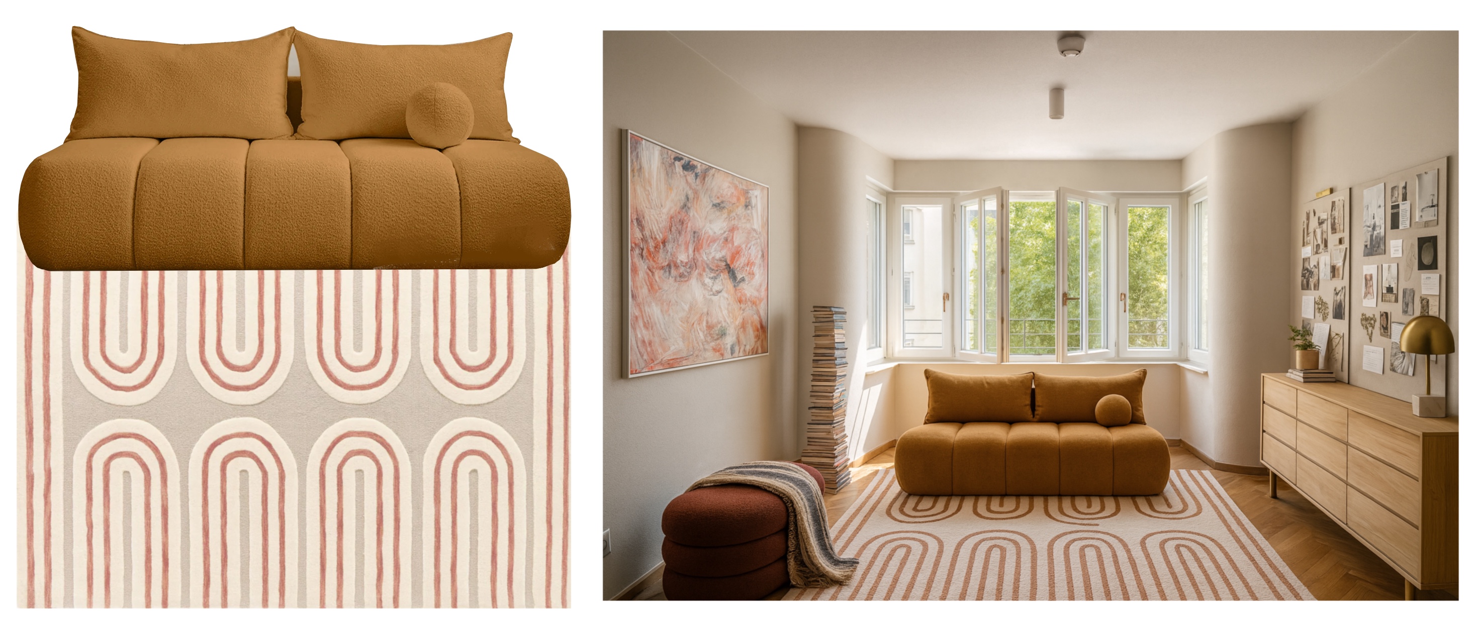 Just yesterday, I tested a new rug in my living room because I fell in love with its colors and playfulness, but before buying, I wanted to make sure it worked with the sofa I literally ordered the day before. And voilà, that’s the final result. Pretty cool, right? :D
