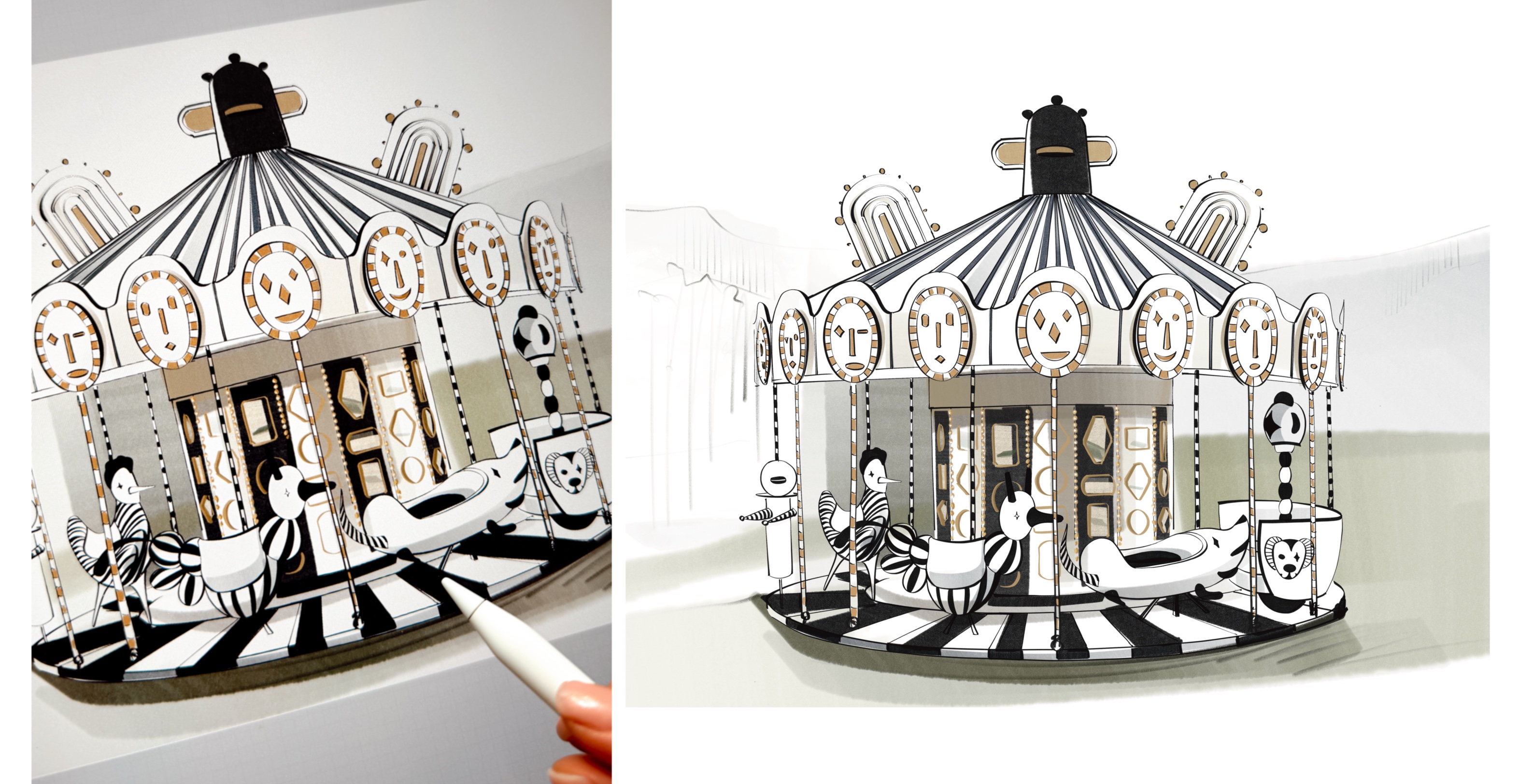 Yesterday, I followed the same approach and sketched the most inspiring carousel I’ve ever seen - just look at the imagination of the designer behind it!!